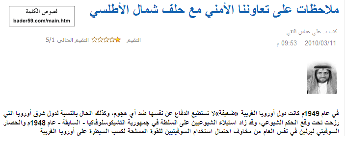 النص السارق : ملاحظات على تعاوننا الأمني مع حلف شمال الأطلسي - د.علي النقي - الوطن الكويتية - 11/3/2010 |